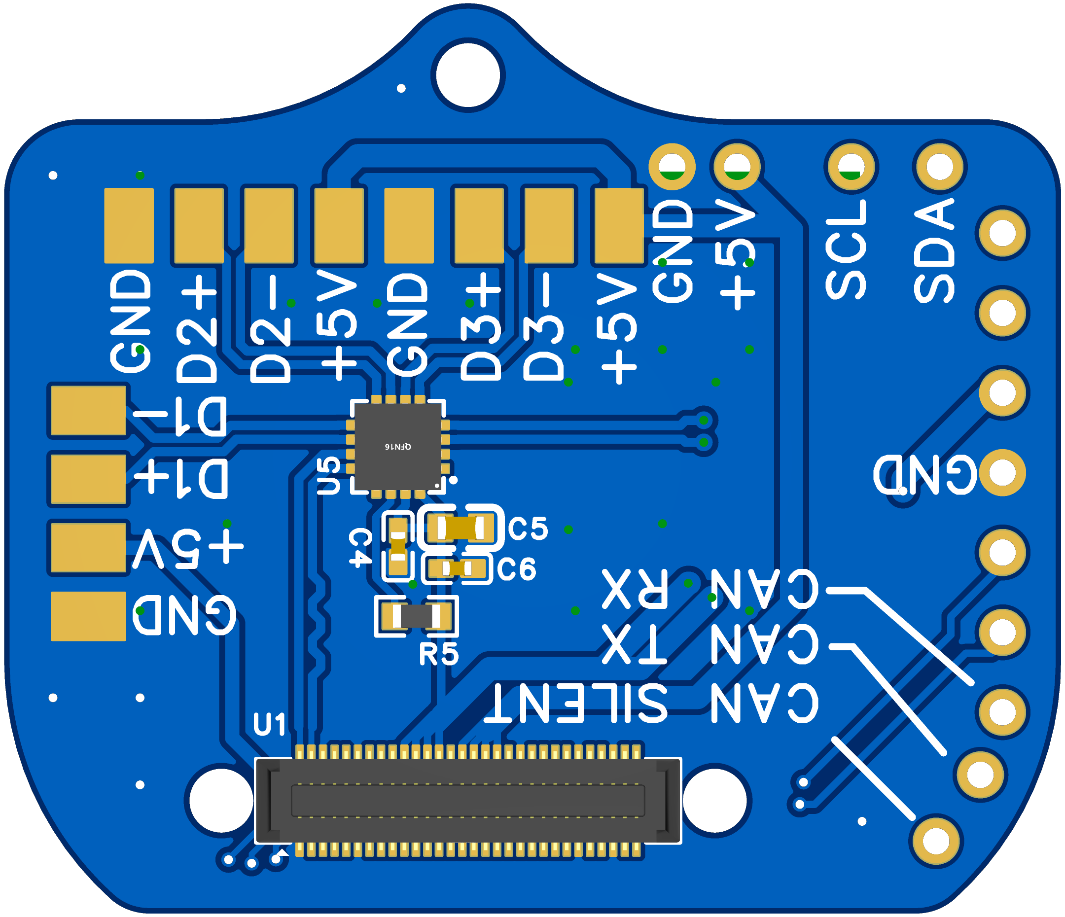 Cette carte d’extension expose quelques interfaces utiles lors du design d’un drone comme des UARTS et un bus I2C. Elle propose également un hub USB2 connecté à l’usb du compute module. 1 sortie du hub est dédiée à la carte wifi, les 3 autres sont disponibles.